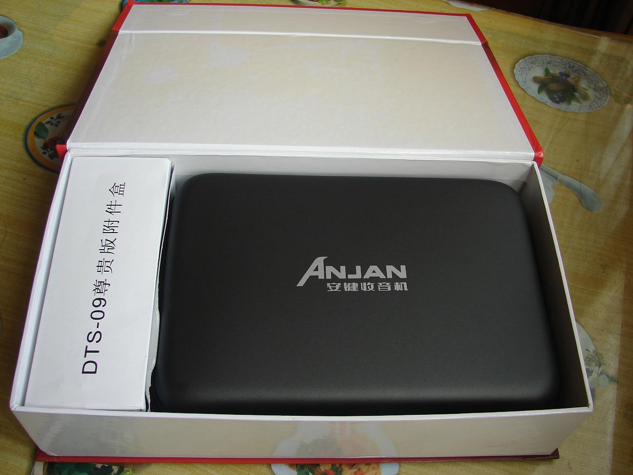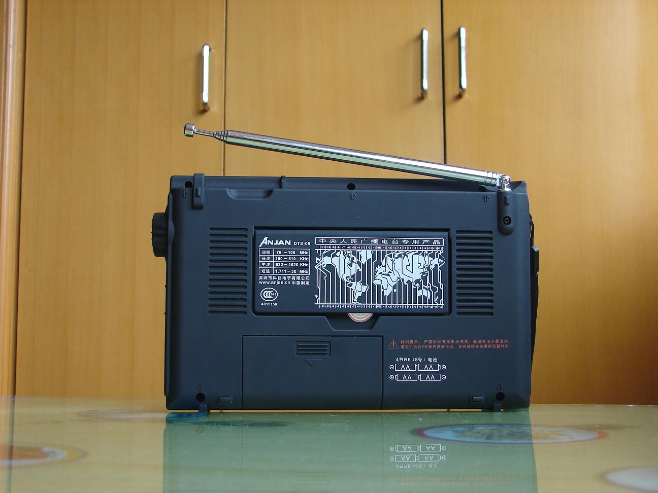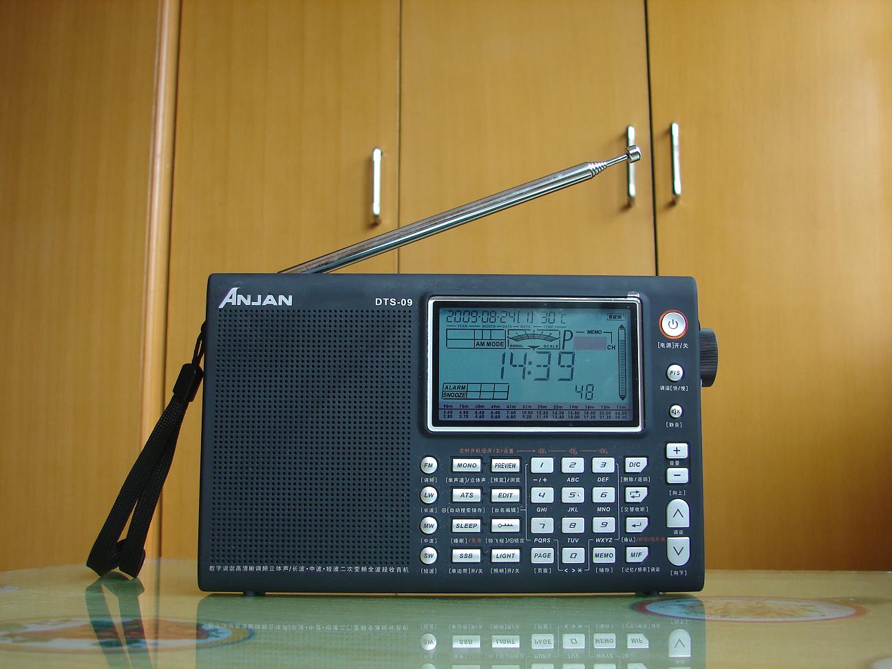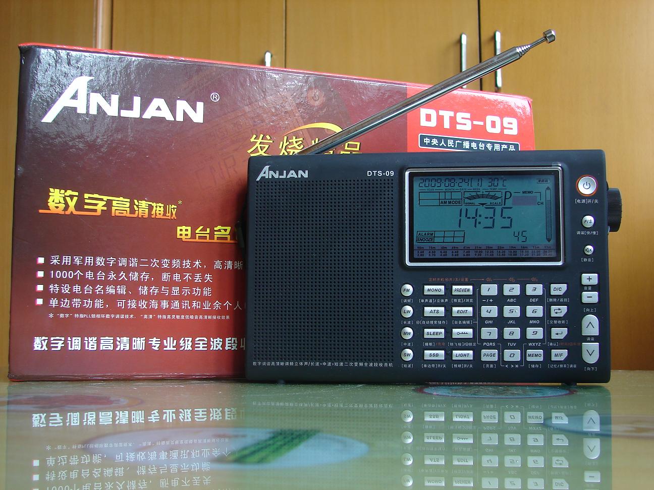 机器的包装很精美,附件也很多,中英文说明书各一本,出奇的是还配给了一只绿色的环保购物袋,机器本身很大,除了软皮的便携袋还配备了软盒保护袋,想的挺周到,试用下感觉接收性能中规中矩,调频不拉天线也能很好的接收本地信号,功能设置完备,SSB单边带接收,多功能飞梭,线路输出输入,电池盖板采用和德劲一样的一体式,可有效防止遗失,高级数调机该有的都有,给人留下深刻印象的是它的操作便捷性,中文面板,特别是设有静音键和回听键,很实用,显示屏很大,内容丰富,可编辑电台英文名,有温度显示,场强表使用的是模拟指针,就是白色背光在晚上看可能太淡了些,音质一般,没有PL600和DE1103好,感觉09的音质是清澈型的,没有过多的修饰,吃点亏.总的来说是台缺点和优点都很突出的数调机,不推荐给只想买一台高级数调机的机友,不过广播发烧友还是可以考虑下的,毕竟它的屏幕显示内容和操作性是目前国产机器里最好的.