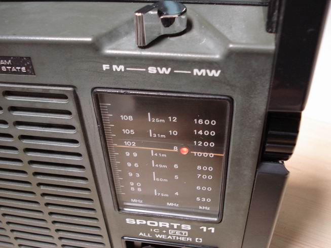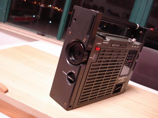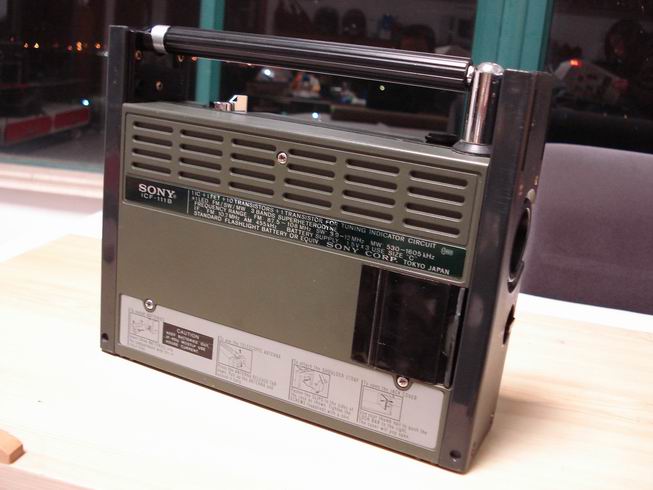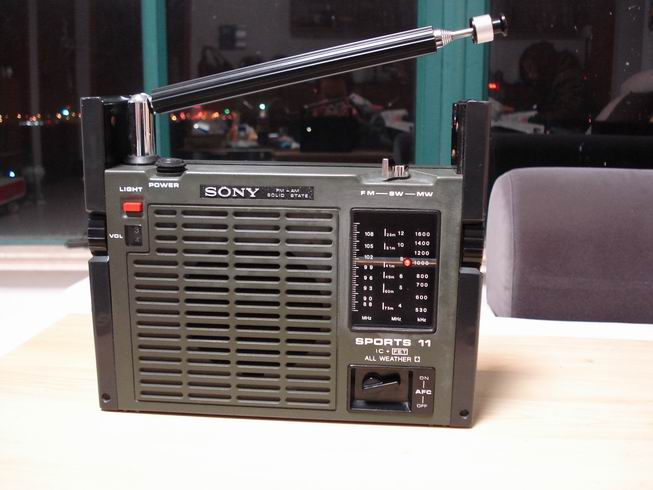 索尼/SONY ICF-111B也叫SPORTS 11 是SONY第一款军用收音机,全天候防淋雨设计,生产年代在1975年左右,所有按钮全部密封防水设计有密封圈,机体接缝处全部采用密封条。天线十分粗壮,有大拇指那么粗,放下可作为提手使用,机身22×18厘米(高),小巧玲珑适合携带。
