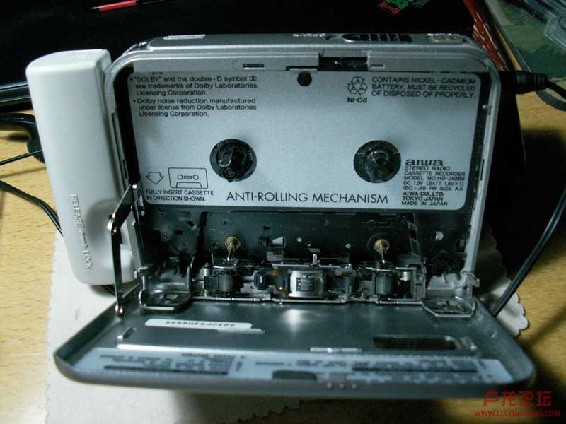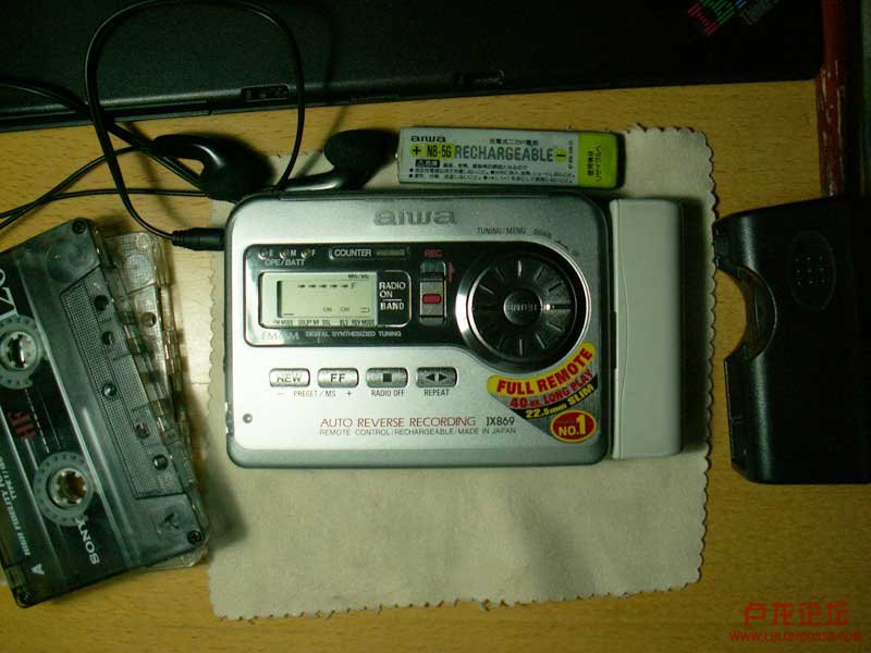 机器金属外壳,品相很新,可见原机主用的比较爱惜。随机有口香糖电池一个(电池已经失效,需要重新配一块),原装充电器一个,外挂5号电池盒一个(此机号称一节5号电池,可播放磁带40小时。)无原配的线控耳机(应该好配上,二手市场淘一个去,嘿嘿)。
