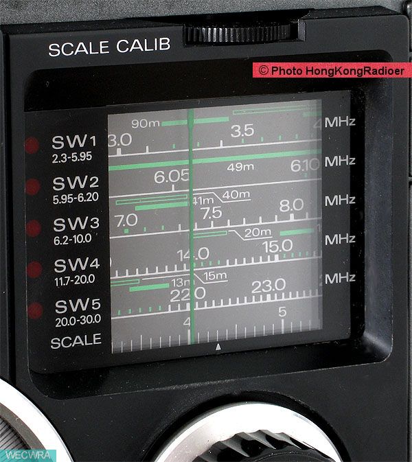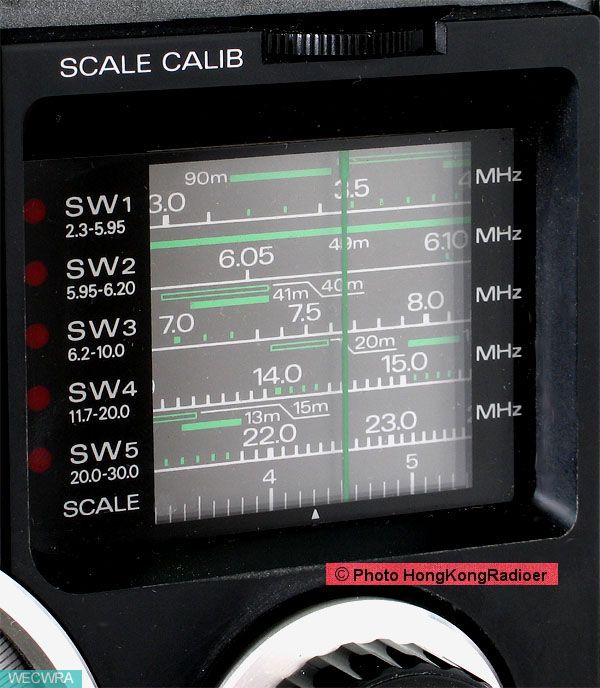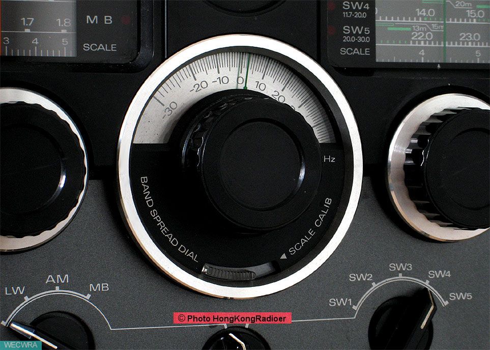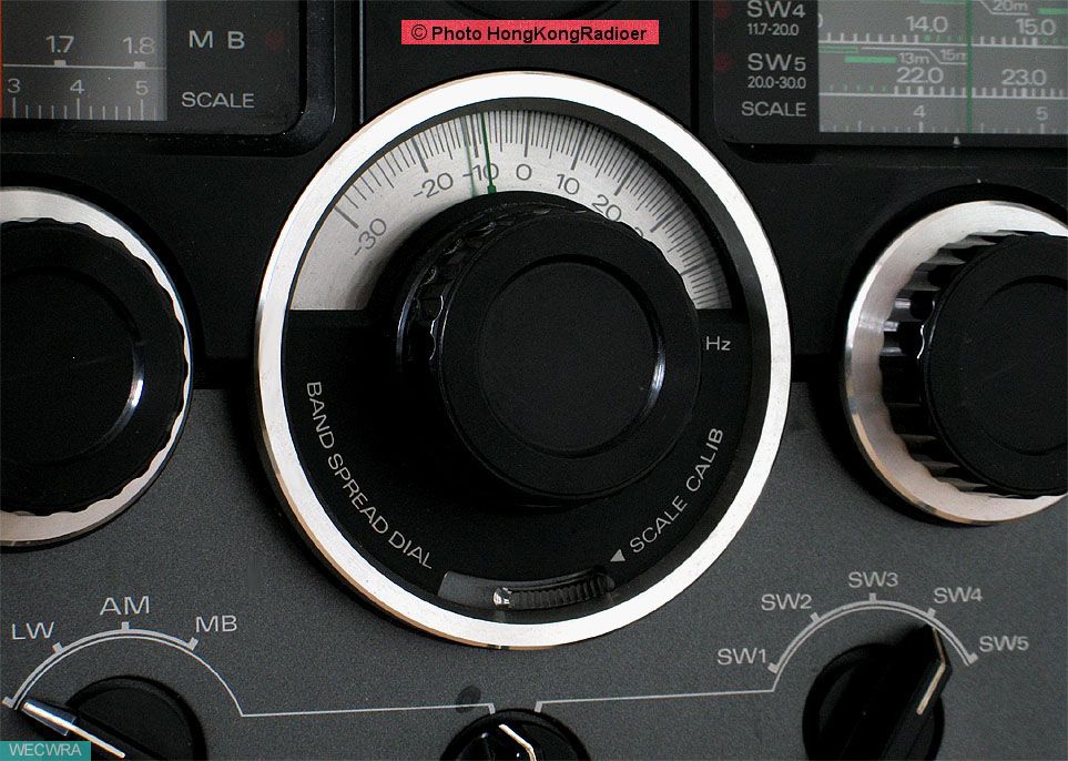 22. 备有一个「波段伸延度盘」 BAND SPREAD DIAL,刻度从-30至130 KHz.以1 KHz.分隔,一并可作160 KHz.的微调;若依短波电台以5 KHz. 相隔计算,这波段伸延度盘最多可作同一短波波段内的32个短波电台的频率微调,并可显示1 KHz.的步进;