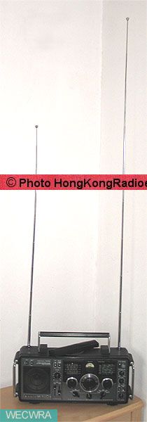8. 备有两条拉竿天线,左面的拉竿天线是接收FM广播专用,拉出时长度为0.89公尺/ 35吋;右面的拉竿天线为短波专用,拉出时的长度为1.3公尺 / 51吋;