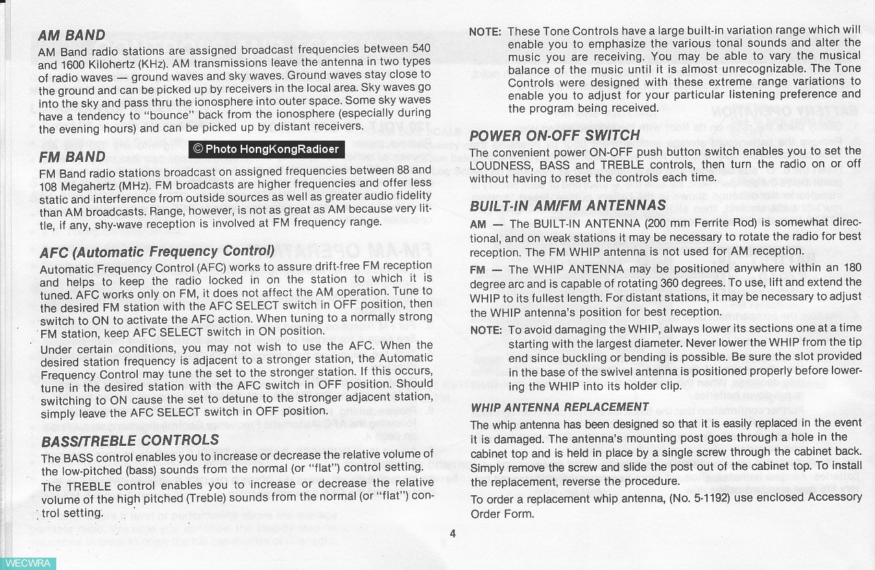 13. 设有独立的高音及低音控制、 FM设有AFC选择开关;