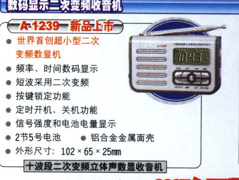 安健A-1239 广播发烧网 发布于 2006-2-18 00:00 收音机 频率/时间指示打盹功能指示调频立体声指示电量指示信号强度指示睡眠定时自动关机指示定时开机功能指示中波频率单位(千赫兹)调频,短波频率单位(兆赫兹)短波波段指示中波波段指示调频波段指示 文章目录 × 推荐阅读50~70年代国产收音机的几款经典机型中国收音机百年史SONY 最后一台高端全波段收音机的前世今生浅谈收音机的百年发展历史固件版本为078版本的山进909X2收音机的整体表现不错国产古董级晶体管收音机——东湖牌收音机新机亮相--德劲DE1108小米LED灯下的德生PL-230德生PL-330拆机高清大图从上海滩起家的中国收音机100年史,背后是集成电路的发展史 上一篇 凯隆KK-9906S校园广播FM立体声十波段收音机分解 下一篇 给初学者的知识