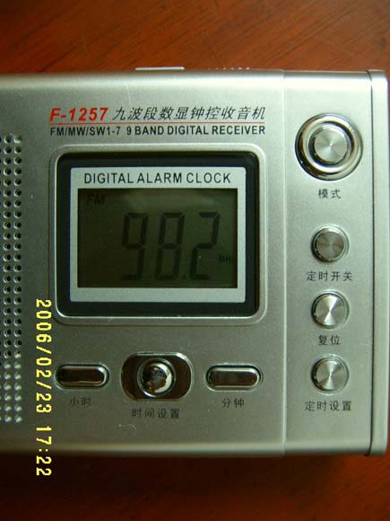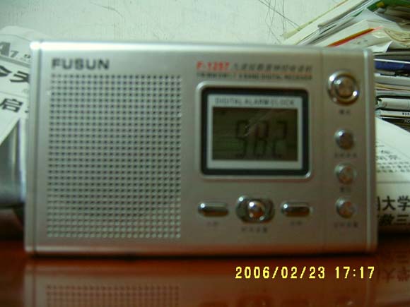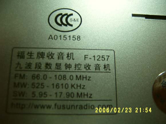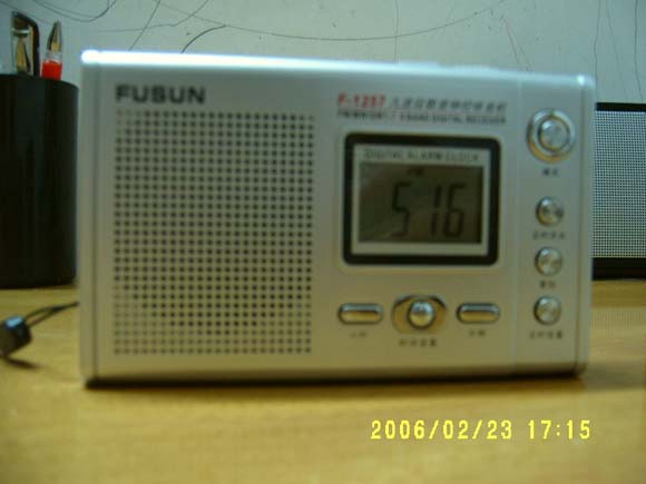 福生F-1257,25元很便宜 广播发烧网 发布于 2006-2-25 00:00 收音机 因办公室没有时钟,我又怕带手表,又想听中国之声MW756的早8点晚16:30的体育直播间,又怕好的东西被盗,昨天从菜市场买了一台福生F-1257,25元还送2节电池.1、包装盒,很有味道 2、正面。心急,照的不好凑乎看看吧3、各侧面 4、与德生R-90125、看看这个3C号码与安键一样就知道他们是一家6、看看背面很象 文章目录 × 推荐阅读50~70年代国产收音机的几款经典机型中国收音机百年史SONY 最后一台高端全波段收音机的前世今生浅谈收音机的百年发展历史固件版本为078版本的山进909X2收音机的整体表现不错国产古董级晶体管收音机——东湖牌收音机新机亮相--德劲DE1108小米LED灯下的德生PL-230德生PL-330拆机高清大图从上海滩起家的中国收音机100年史,背后是集成电路的发展史 上一篇 3月1日下午一小时的桂江下游收听手记(图片说话) 下一篇 凯隆KK-9906S校园广播FM立体声十波段收音机分解