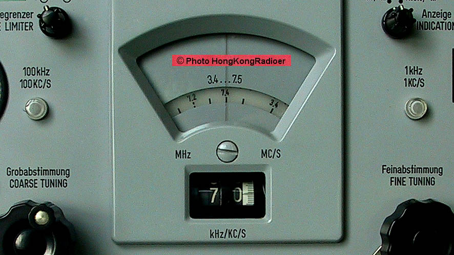 20. 这机在调至已知频率收听时,也十分方便,如想接收7470 KHz.的信号时,先把粗调旋钮旋至7.4的刻度处,然后再把微调旋钮旋至7.0的刻度即可,如下图: