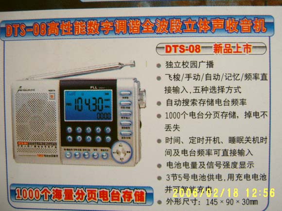 DTS-08终于横空出世 广播发烧网 发布于 2006-2-18 00:00 收音机 1000个超大容量分页存储飞梭调谐,可快速准确选台和寻址智能充电全波段频率可快/慢选择,选台更加快速精准按键及显示具有智能超强兰色背光照明频率和时间可同时显示 文章目录 × 推荐阅读50~70年代国产收音机的几款经典机型中国收音机百年史SONY 最后一台高端全波段收音机的前世今生浅谈收音机的百年发展历史固件版本为078版本的山进909X2收音机的整体表现不错国产古董级晶体管收音机——东湖牌收音机新机亮相--德劲DE1108小米LED灯下的德生PL-230德生PL-330拆机高清大图从上海滩起家的中国收音机100年史,背后是集成电路的发展史 上一篇 凯隆KK-9906S校园广播FM立体声十波段收音机分解 下一篇 给初学者的知识