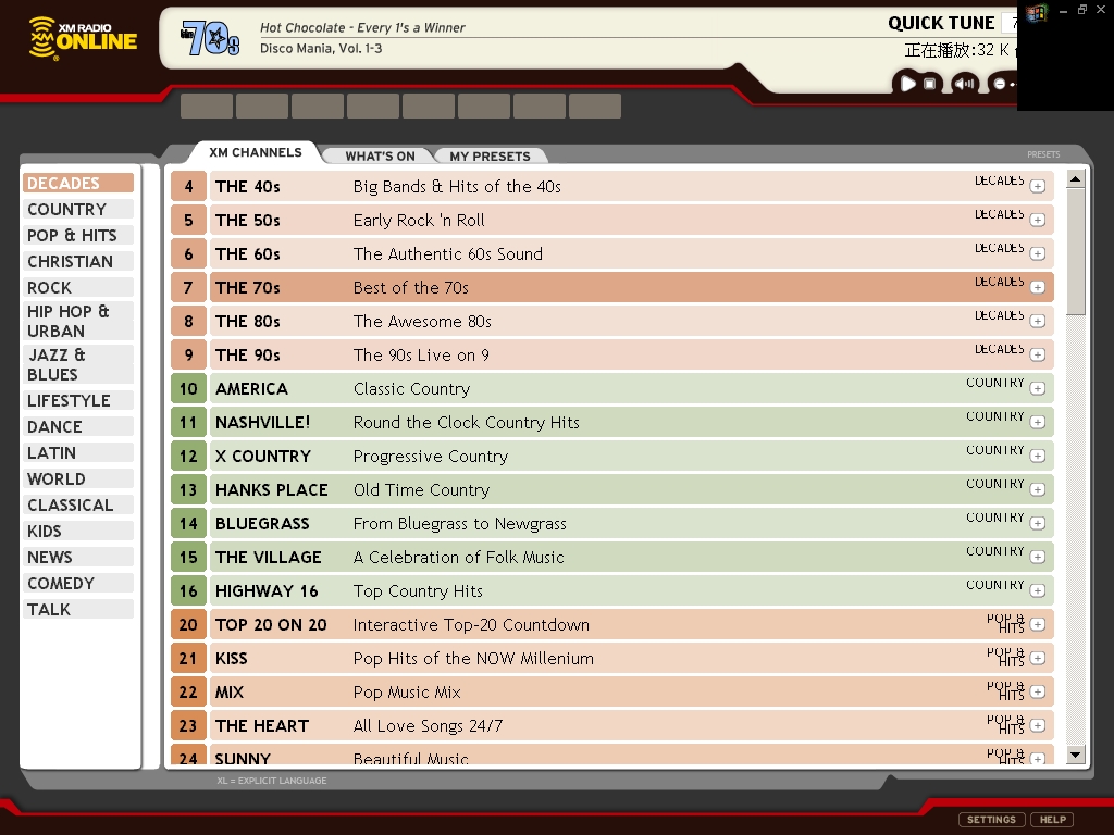 11. 这机的XM功能在美洲以外地区是不能使用的;不过,在美洲以外的地区也是可以收听到这个美国XM卫星广播电台的节目的,这就是上网收听,这电台有>150个不同的频道,以音乐和新闻为主,想听老军医指导的爱好者可要失望了,呵呵: