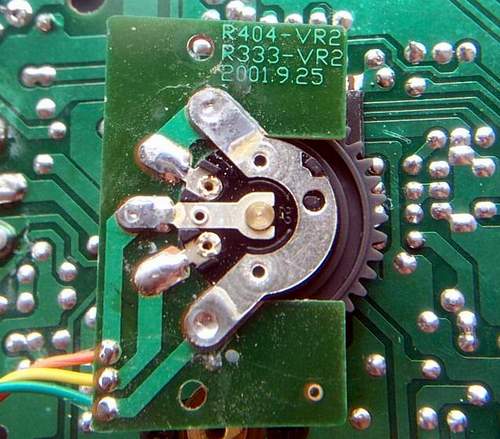 安装于面板的指针齿条,在面板与底盒并合时,通过线路板上的,调谐电容的齿轮啮合获得传动,拆装时,需要小心对准。波段切换的拨动是通过一个塑料滑块卡住波段开关柄实现的,塑料滑块上的橘色斑块通过刻度盘的对应小孔显示以指示当前选择的波段。