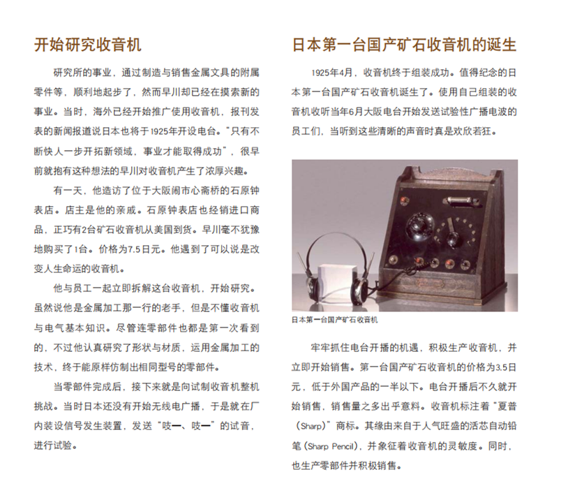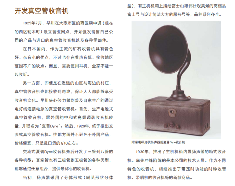 夏普的历史中显示,1925年4月逆向设计组装出第一台日本产矿石收音机,价格是美国货的一半,当年6月日本大阪开始有了日本第一座电台。1929年,推出电子管收音机。