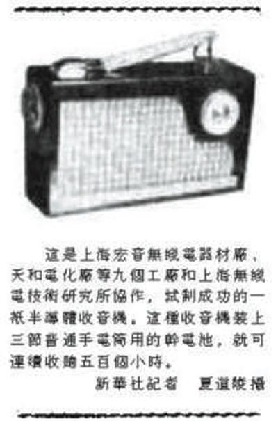 编者按: 1958年3月13日,人民日报报道我国第一台半导体收音机在上海诞生。