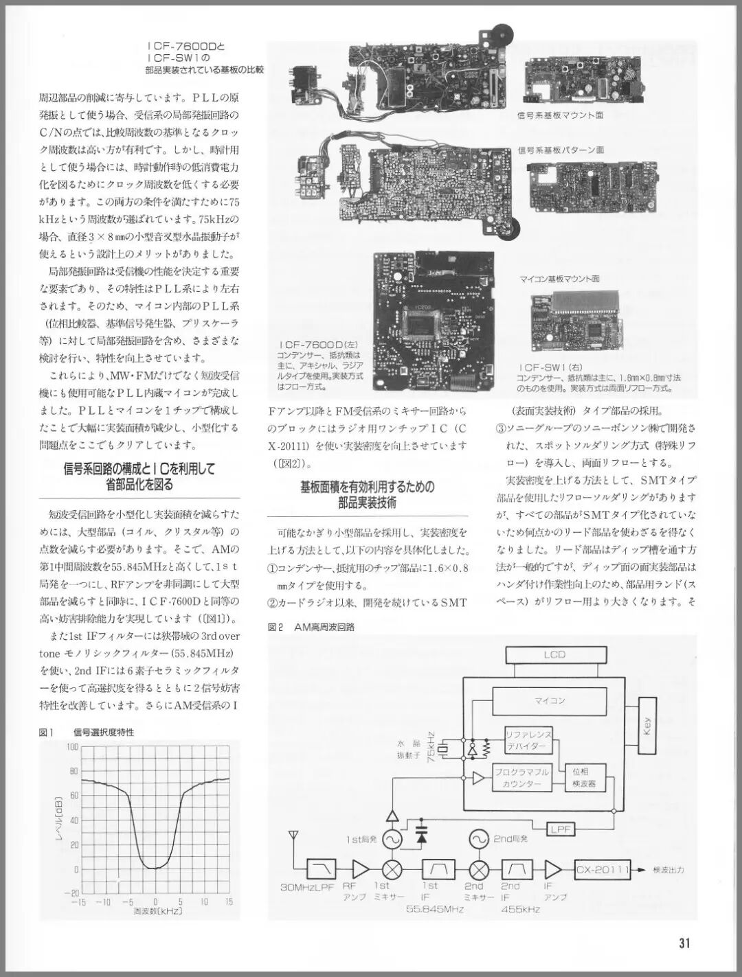 因此通过将 AM 的第一中频(1st IF)提高到 55.845 MHz,使第一本振(1st Local)统一为一个,并将 RF 放大器设为非调谐式,在减少大型元件的同时,实现了与 ICF-7600D 同等的高抗干扰能力(见图 1)。