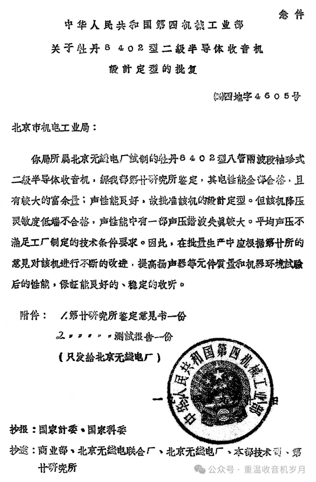 图9 四机部关于牡丹8402设计定型的批复