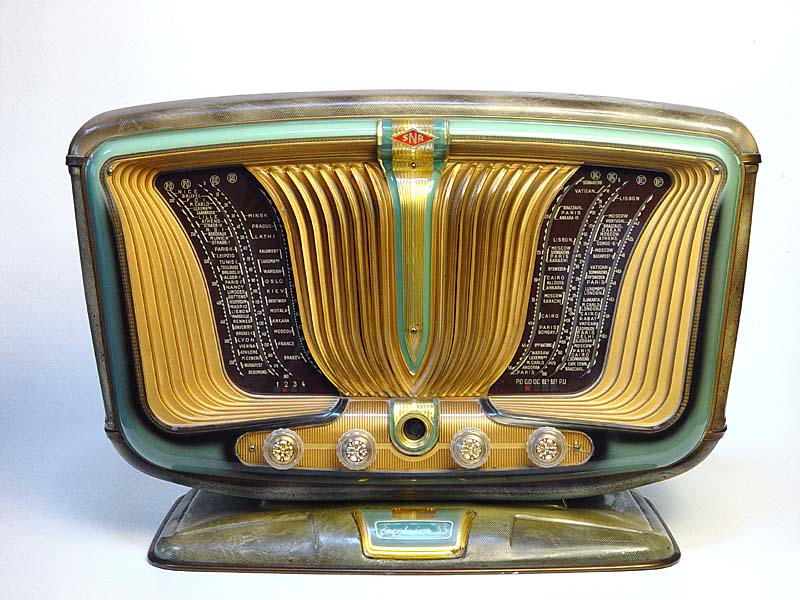 战后法国设计重视各种新材料的应用,金属、塑料、木材、玻璃钢、有机玻璃等在收音机上进行综合利用,取得非常了得的效果。