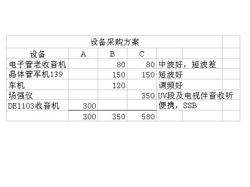 方案A:买个1103。从性能表中可以看出,1103除了没有超短波(FM除外),其他性能都不差,而且便携,还有SSB功能,虽然SSB只能解决一点好奇心,但至少对我这样的人来说这是很重要的,所以只要有1103在,我是绝对不会买PL550、PL350这样的机机的,当然他们的老板是一个人那是另一回事。
