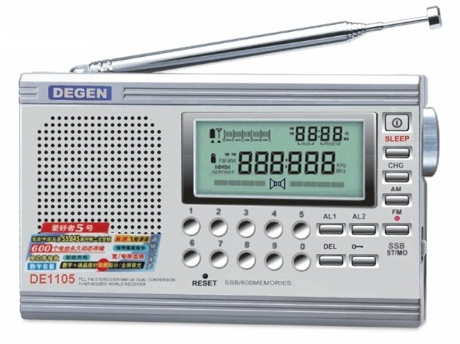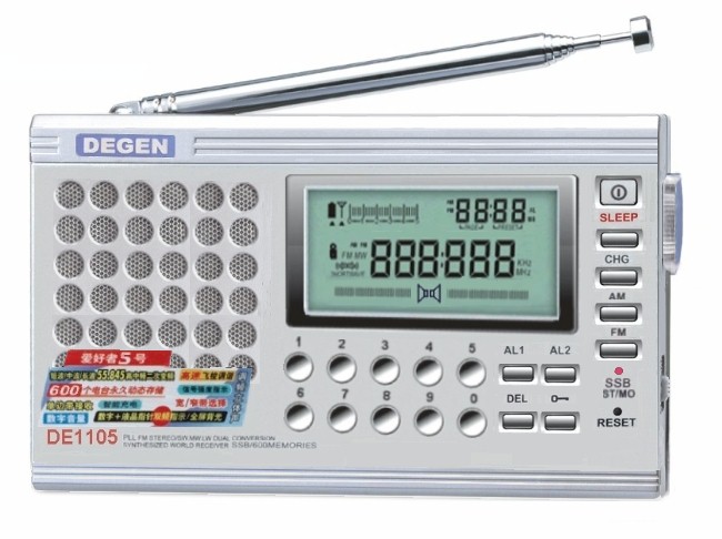 网友自创DE1105 广播发烧网 发布于 2004-5-14 00:00 动态 哈哈!!!我的爱好者五号(DE-1105)产品名称 DE1105数字调谐调频立体声/中波. 短波.国际接收 功能介绍 调频/短波/中波国际接收。调频频率范围 88.00-108.0MHz,TV-1、TV-2,步长25K。调幅(含短波.中波)频率范围:520-29999KHz,步长1K。调幅波段高中频(55.845MHz)二次变频,高灵敏度,高抗干扰性能。飞梭/自动搜索/记忆/直接输入/语音输入五种调谐方式。600个电台永久存储。可用语音/按键记忆、删除,信息永久保存。电子音量控制,两种调节方式:数字直接输入与飞梭调节。 智能快速充电功能(兼容镍氢/镍镉电池),充电倒计时查询。单边带(SSB)接收及微调功能。调幅中频宽/窄带。面板全橙色背光功能,三种背光模式设置。调幅、调频信号强度指示。调幅、调频单声道/立体声选择、音量大小指示。新闻/音乐/超重低音三种音质选择。两个定时开、关机功能(可分别设置定时开机频率与音量)。睡眠关机时间1~99分钟设定。时钟常显、掉电不丢失功能。电子开关按键锁定功能。按键操作错误提示。 电池电量指示,可查看当前电量,电量不足自动关机。进口扬声器,音质优美。设远近程灵敏度选择开关,方便接收不同环境、米你型机身设计便于携带。内置式360度旋转拉杆天线。使用2节5号电池供电。附送高级立体声耳机、外接天线、外接稳压电源适配器、2节5号镍氢充电电池、绒面布套。外型尺寸:110x71x20mm 文章目录 × 推荐阅读SHARP夏普宣布恢复生产盒式录音机、GF-777N便携式收音机德生TECSUN PL-880 全波段数字调谐立体声收音机上市TECSUN H-501、PL-990 全波段数字调谐立体声收音机/音乐播放器上市公告日本厂商2023年推出新款磁带收音机:支持U盘数据转录2025年夏季短波调谐频率TECSUN PL-660全波段数字调谐收音机全球同步上市!(2010-11-12)厂家纷纷倒闭,互联网收音机何去何从收音机为什么不淘汰掉?因为在特定场合仍需使用它TECSUN PL-380全波段数字解调立体声收音机上市公告从收音机到智能座舱,从听到动动嘴改变“世界”,车机系统已经走过了100年 上一篇 菜鸟测评DE1103(全部) 下一篇 收音机爱好者的QQ群
