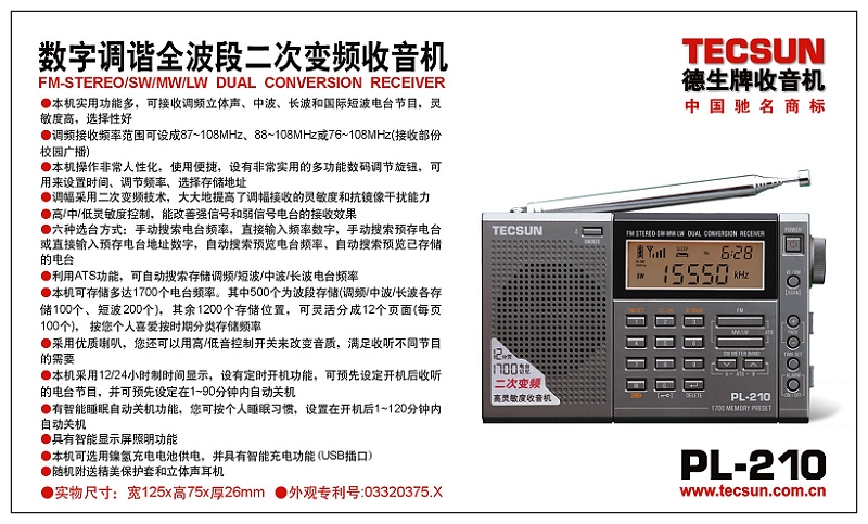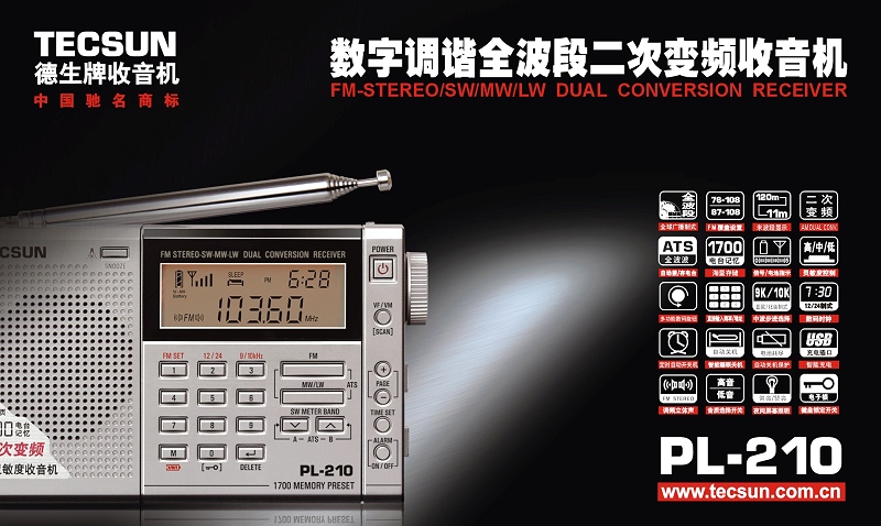 TECSUN PL-210 数字调谐式调频/短波/中波/长波二次变频立体声收音机上市公告