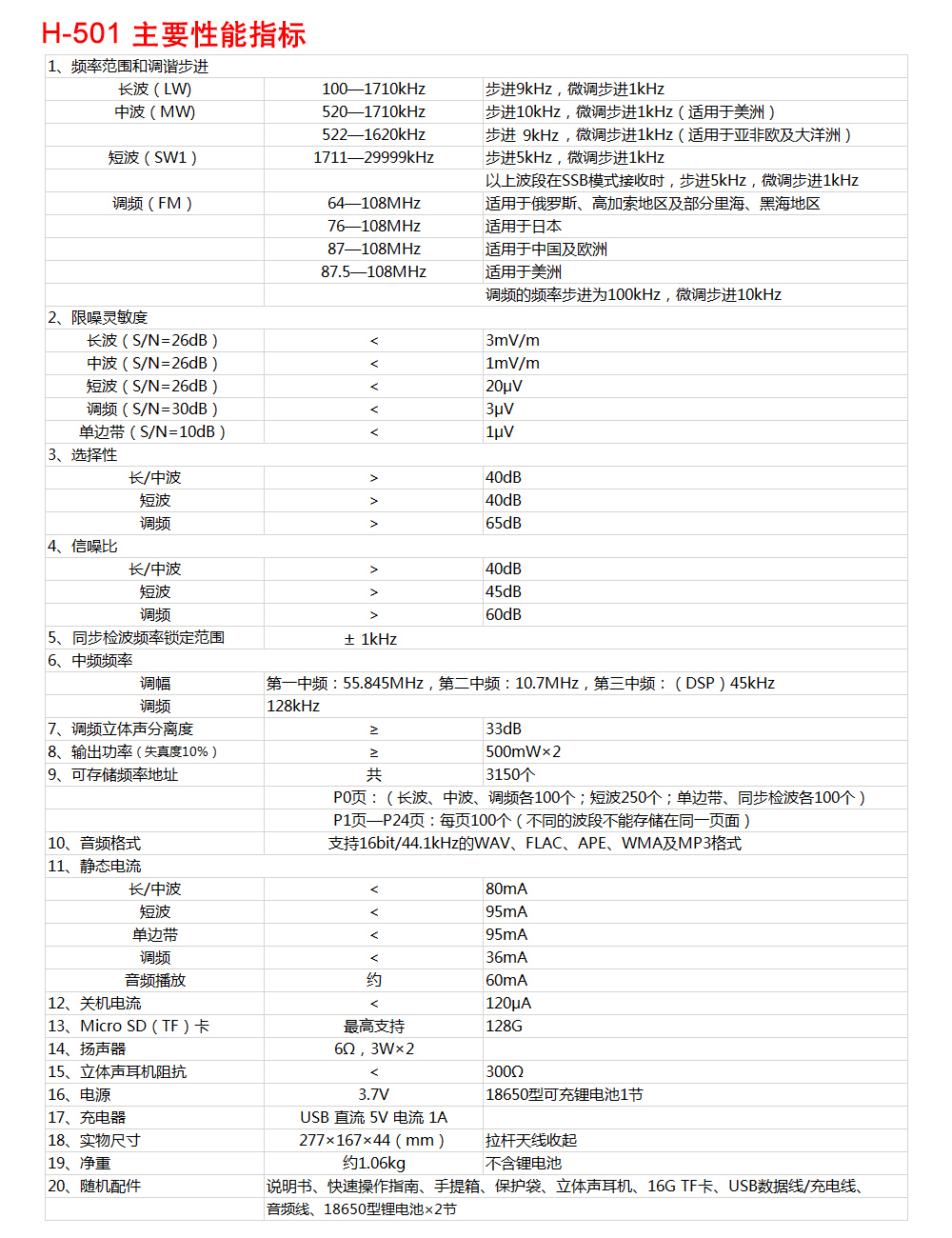 一、TECSUN/德生 H-501 双喇叭便携式全波段收音机/音乐播放器