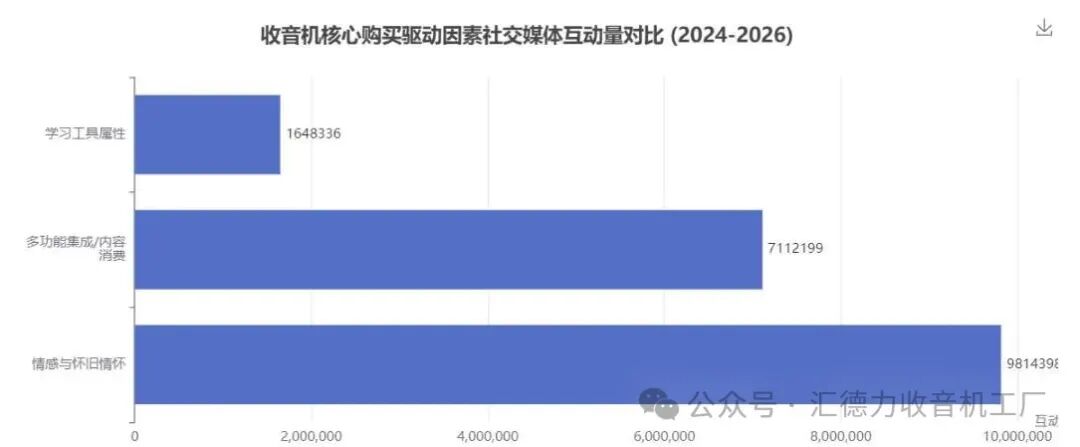 消费者购买收音机的核心驱动因素呈现多维度特征,其中情感与怀旧情怀的驱动力尤为显著,在社交媒体上引发了近千万次互动。多功能集成与内容消费紧随其后,而学习工具属性也占据了重要一席之地。