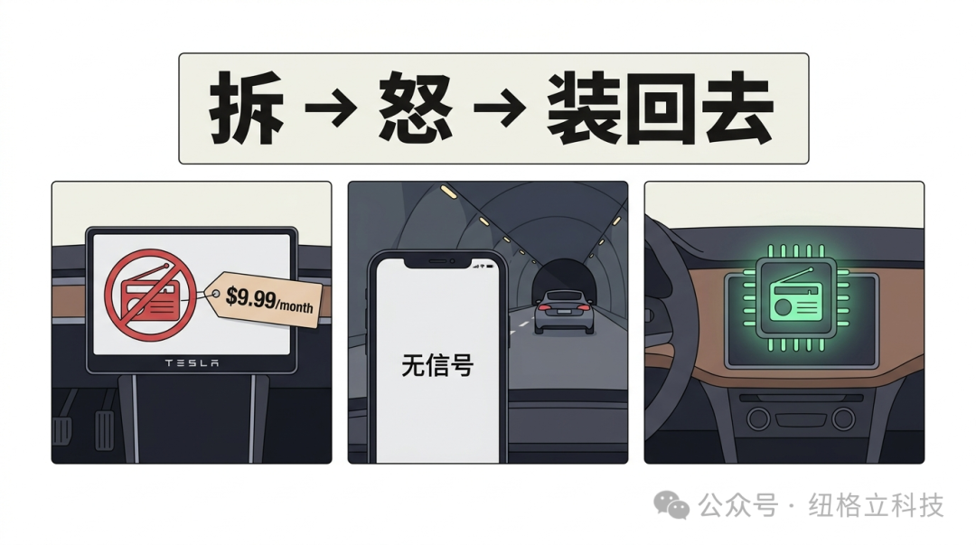 "取消收音机"的浪潮来过了。它来自一个过度乐观的假设:蜂窝网络无处不在、永不宕机、人人负担得起。西班牙大停电用10个小时证明了这个假设的脆弱;飓风海伦用3432座基站的瘫痪证明了这个假设的危险;特斯拉$9.99/月的订阅费用证明了这个假设背后的商业动机。