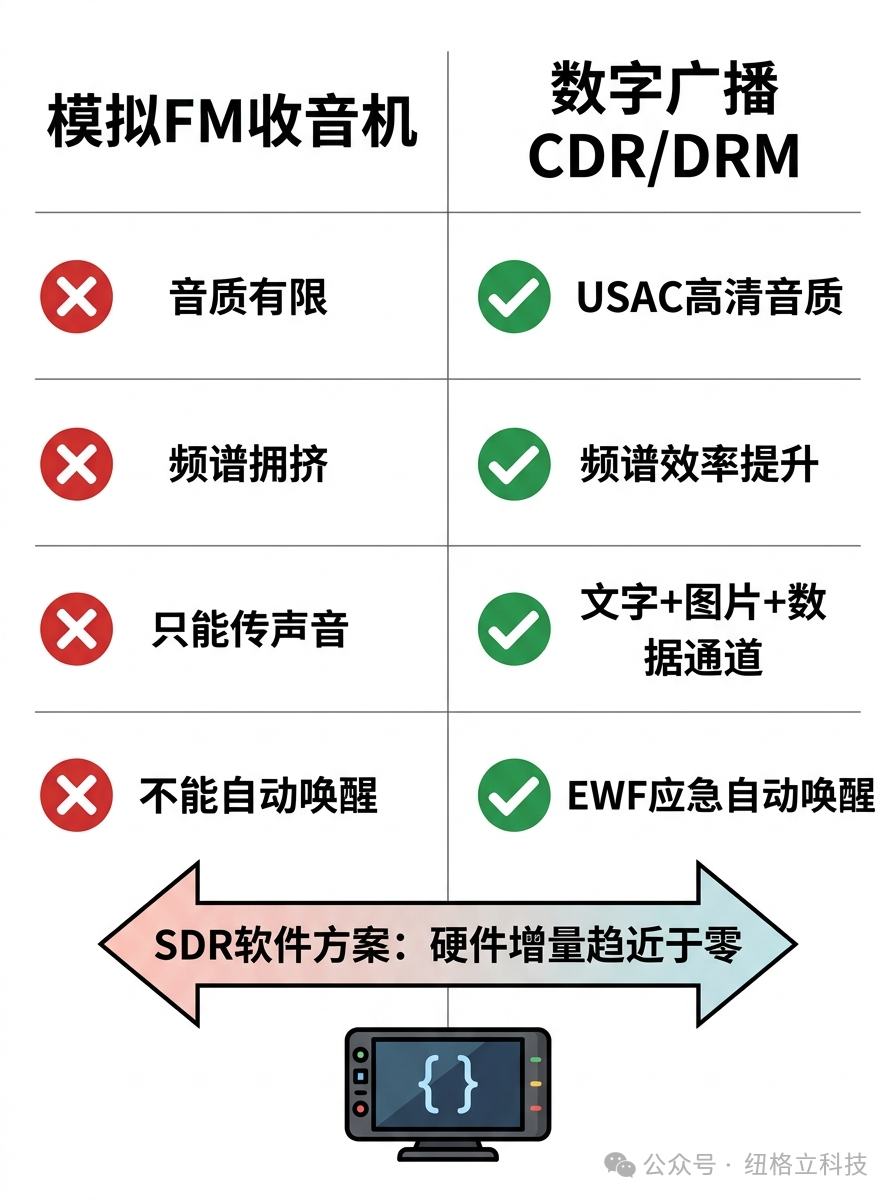 如果在2026年给每辆新车装一台只能收FM/AM的模拟收音机,固然解决了"有没有"的问题,但等于给一辆装着10英寸智能中控屏的汽车配了一台1960年代的收音技术。