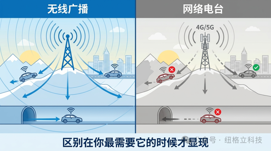 对于大多数消费者来说,"联网电台"和"无线广播"在正常使用时几乎没有区别——直到他们开进隧道、驶入山区、或者流量套餐用完的那一刻。