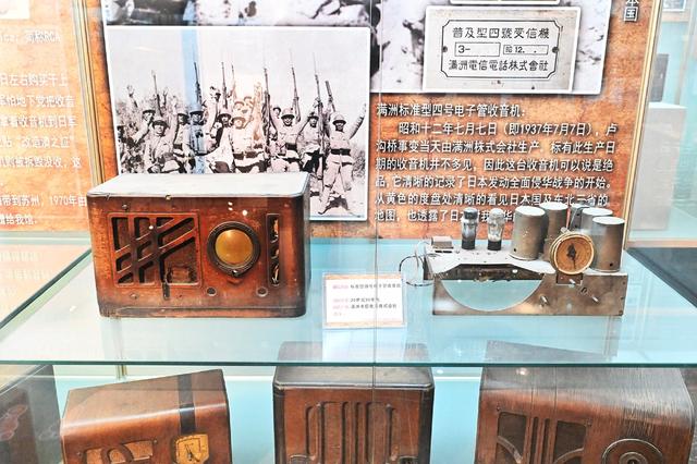 一旁展出的收音机生产时间为1937年7月7日,正是卢沟桥事变当天。这台名为“满洲标准型四号”电子管收音机的度盘上面,不仅印着日本地图,还有朝鲜半岛和我国东三省的地图,印证当时日本侵略者的野心。胡畔说:“度盘是调台用的,可以看到度盘上只有0到100,是因为当时日本电台的波段就是0到100,这也说明这台收音机即便是在中国生产,也只能收听日本的电台。”