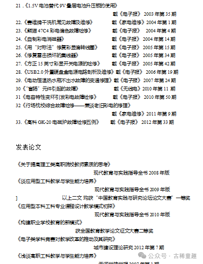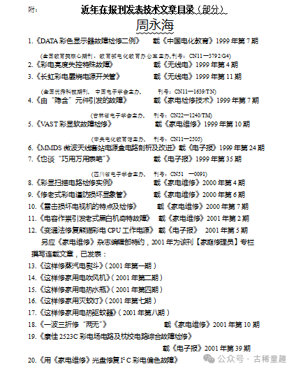 长期的电器维修实践,不仅让我的知识面不断拓宽,更积累了为数甚多的实战经验。我还将这些心得与经验整理成文,在全国知名的《无线电》、《家电维修》、《电子报》等杂志报刊上,发表了几十篇技术文章,收获了大批读者的喜爱与认可,这份来自同行与读者的肯定,更是对我半生热爱的最好嘉奖。